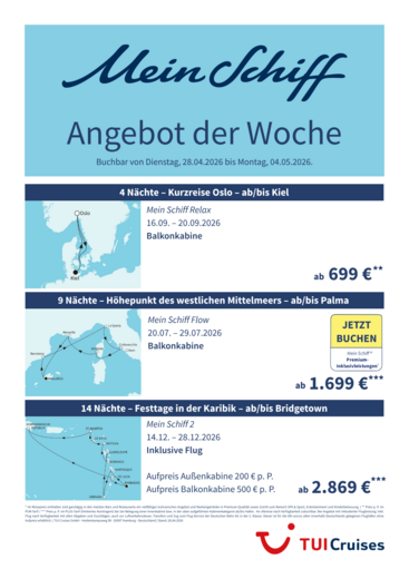 Erlebe unvergessliche Urlaubsmomente auf dem Meer! Sichere dir jetzt tolle Angebote für exklusive Kreuzfahrten mit Mein Schiff. Diese Woche kannst du zwischen drei fantastischen Routen wählen: