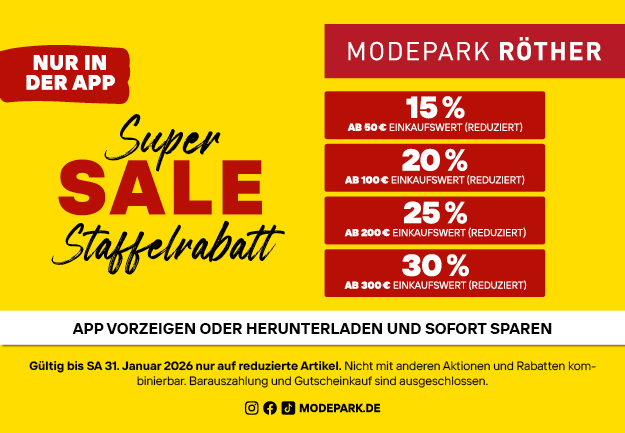 Mit dem Super Sale Staffelrabatt sparen Sie bis zu 30% zusätzlich auf bereits reduzierte Artikel! Einfach Modepark Röther App vorzeigen oder herunterladen und sofort sparen.