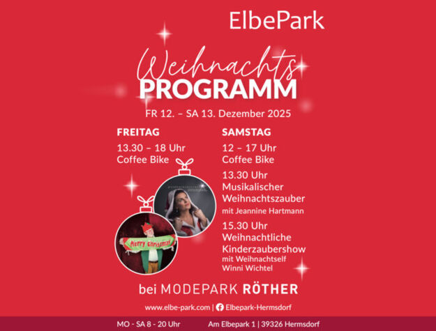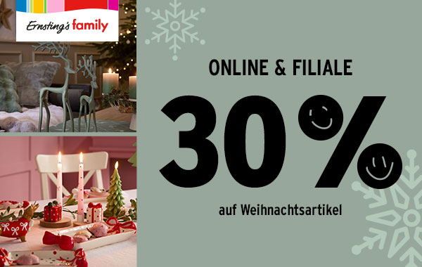 Vom 05. bis einschließlich 07. Dezember 2025 erhalten alle Kundinnen und Kunden in der Ernsting’s family Filiale im ElbePark Hermsdorf 30 % Rabatt auf Weihnachtsartikel. Nutzen Sie die Gelegenheit, um Dekoration, Geschenkideen und winterliche Highlights zu entdecken.